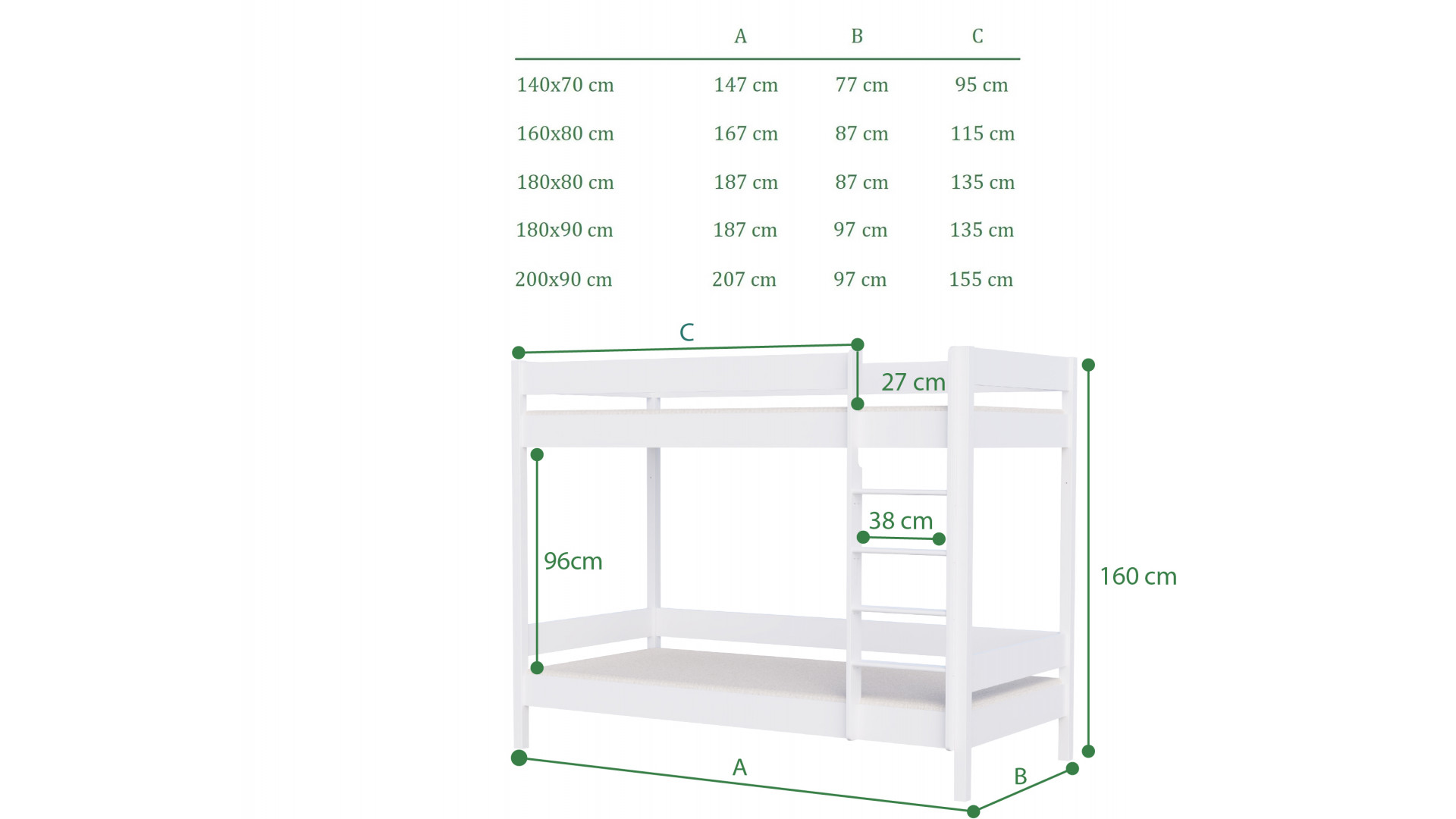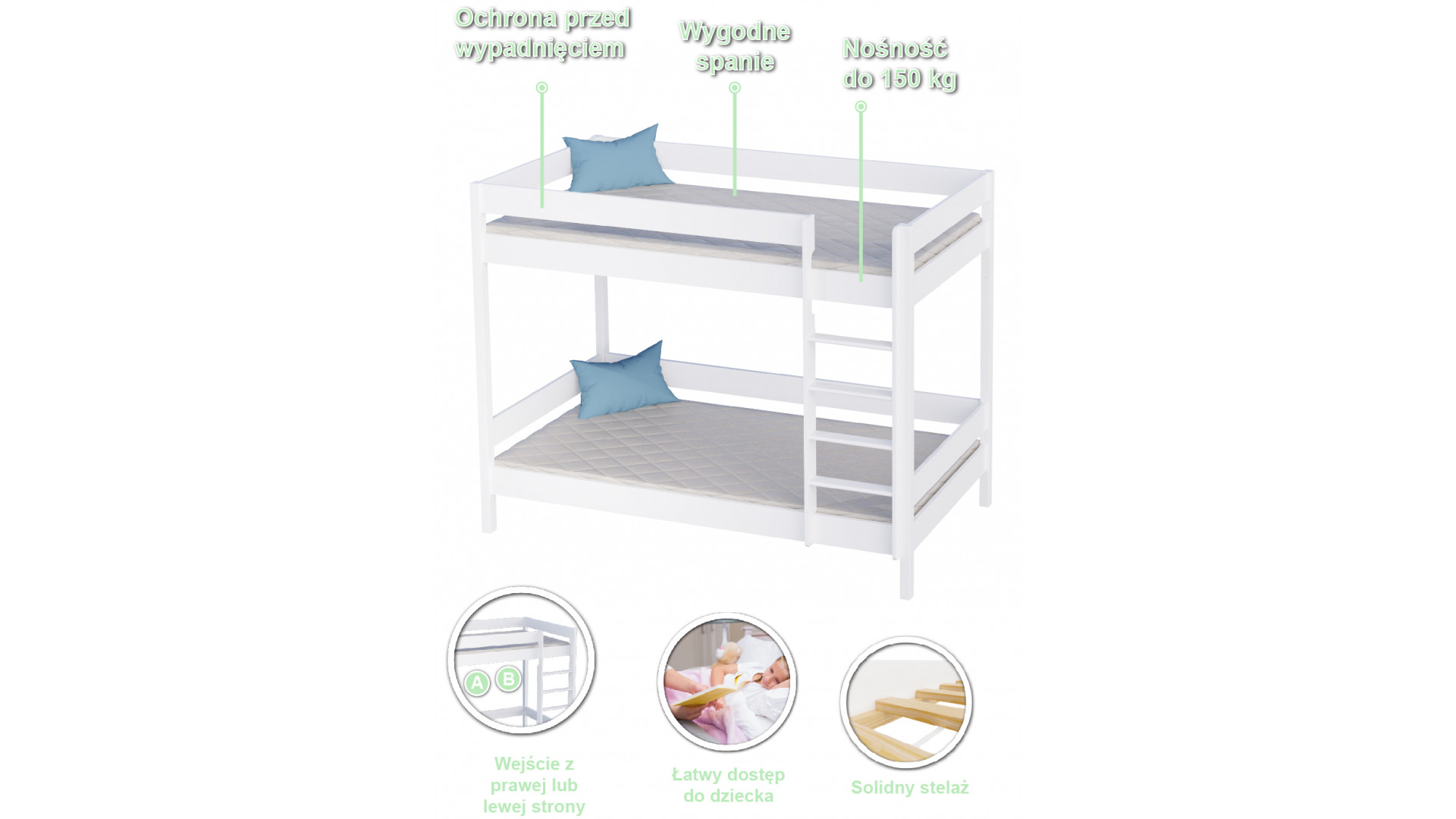 Łóżko przeznaczone dla dwóch osób. Przestrzeń między łóżkami pozwala na swobodne siedzenie. Funkcjonalna konstrukcja pozwala na zagospodarowanie większej ilości miejsca. Barierki ochronne zapobiegają wypadnięciu.