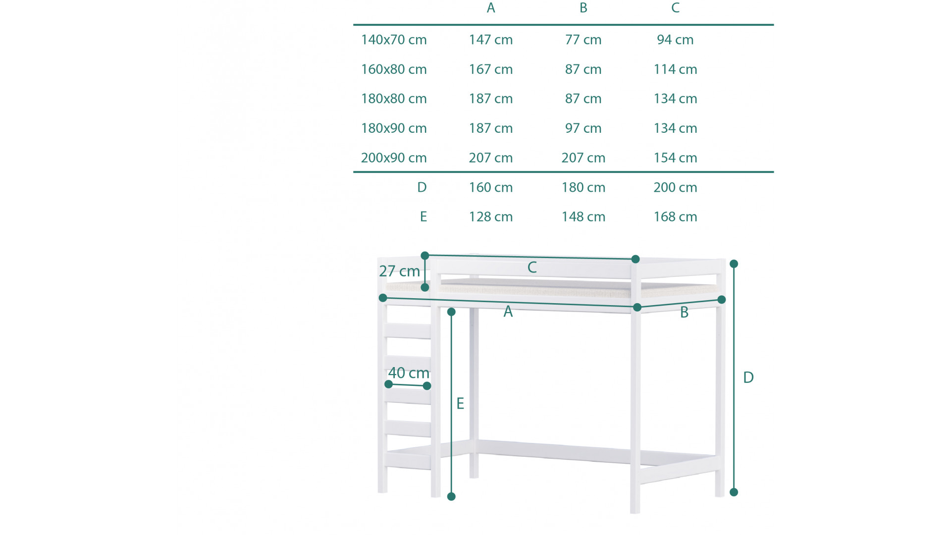| Prześwit pod łóżkiem | 128cm | 148cm | 168cm |
